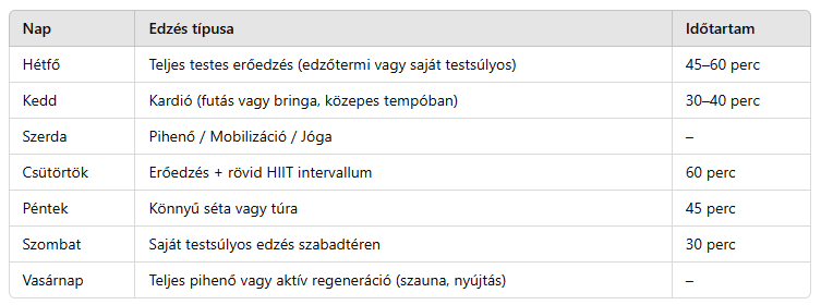 Heti 2-3 erőedzés ajánlott, teljes testes bontásban. Fókuszban: nagy izomcsoportok (mellkas, hát, comb, váll). Az alapgyakorlatok: fekvenyomás, guggolás, evezés, húzódzkodás, ismétlésszám: 8–12 közepes súllyal, 3-4 sorozat.